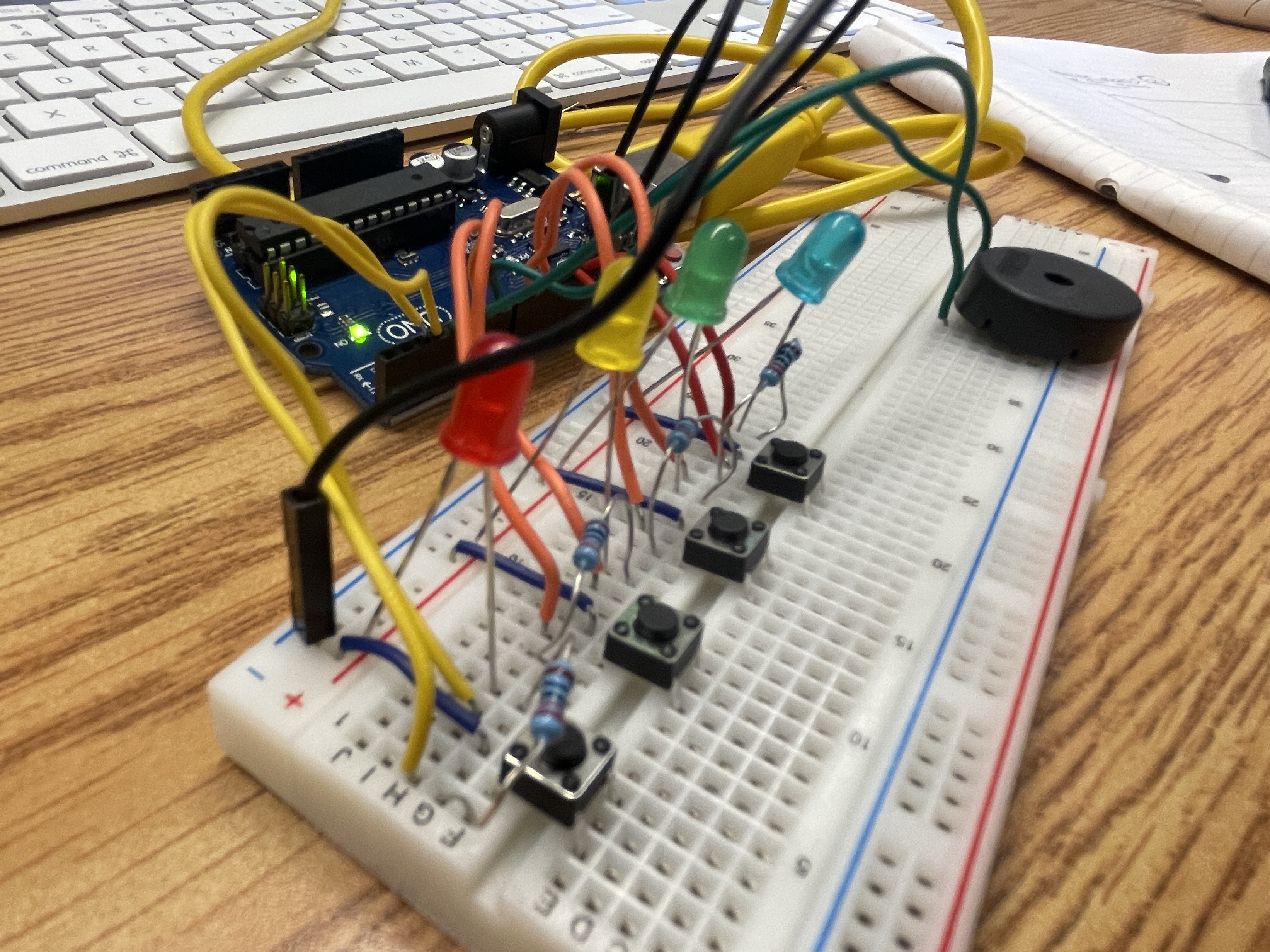 1:Our main objective was to make a memory inspired game using lights and piezo.